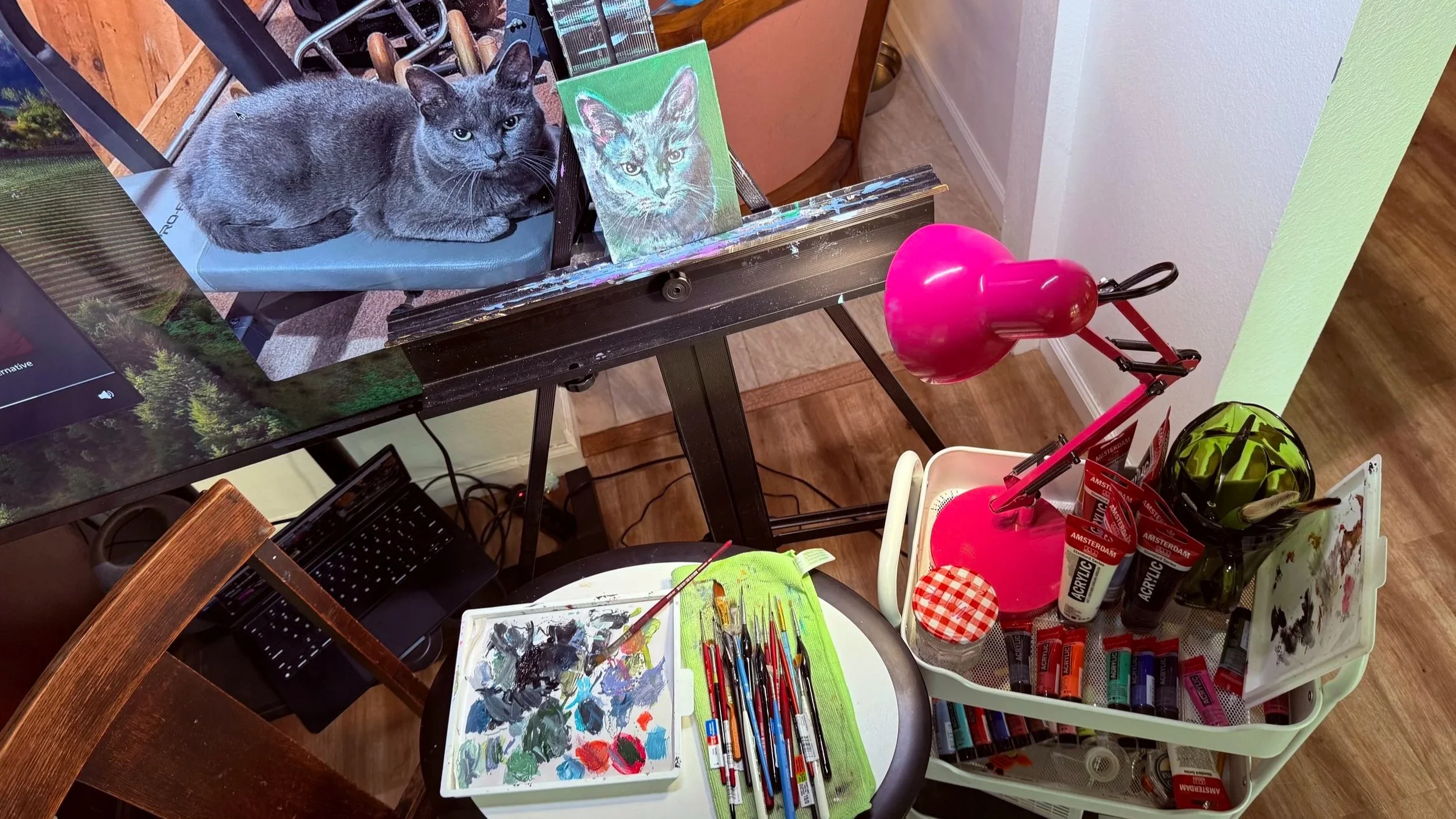 Toledo Art Girl Mikaela Myers 3 separate paintings of dogs in an art studio